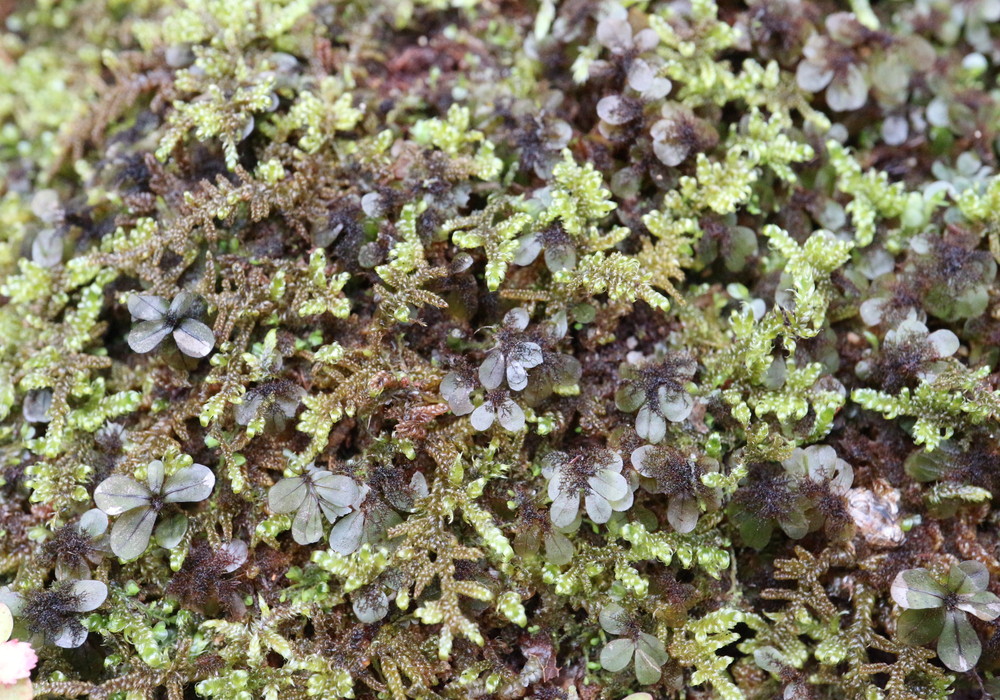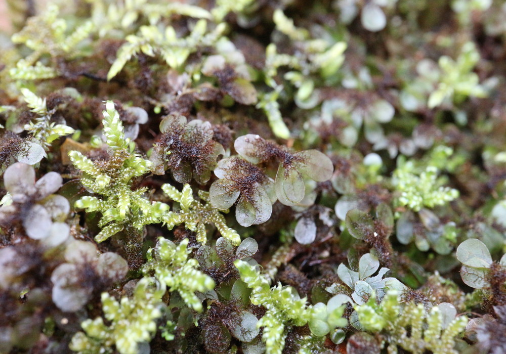 ケチョウチンゴケ。褐色の仮根が葉の上にまで密生する様子が、肉眼でも確認でき、一度覚えると間違うことはないくらい分かりやすい。毛が少ない個体?に出会うとどうなるか? とにかく、現段階で自信を持って同定できるコケの一つです。