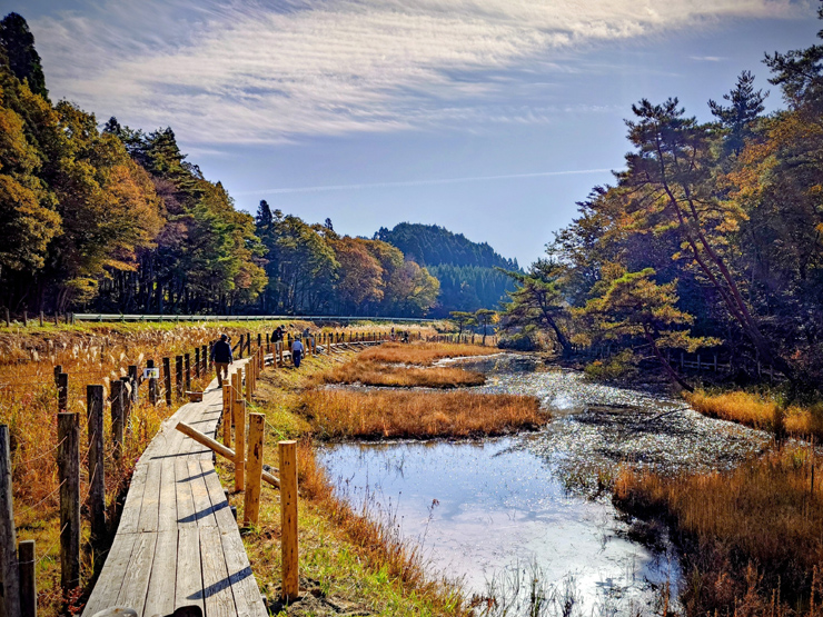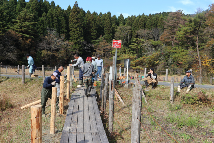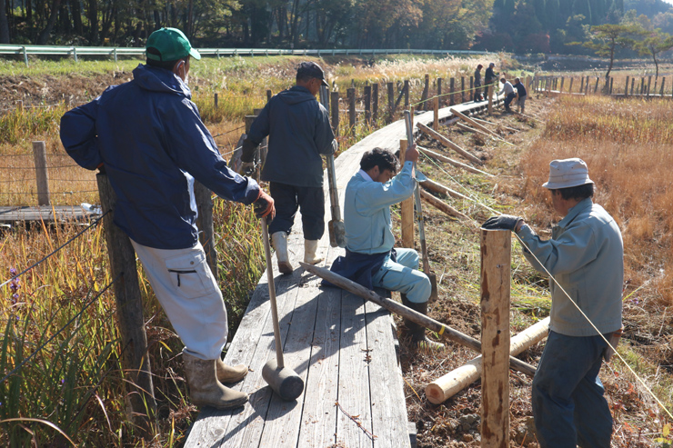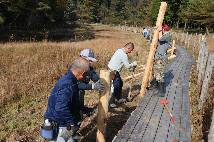 樫原湿原の木道、木柵の設置作業は地元の桑原集落の方々がやってくれています。11月16日は今年の作業日。例年より少し人数が少ないようで、思いがけず大変な一日になりました。