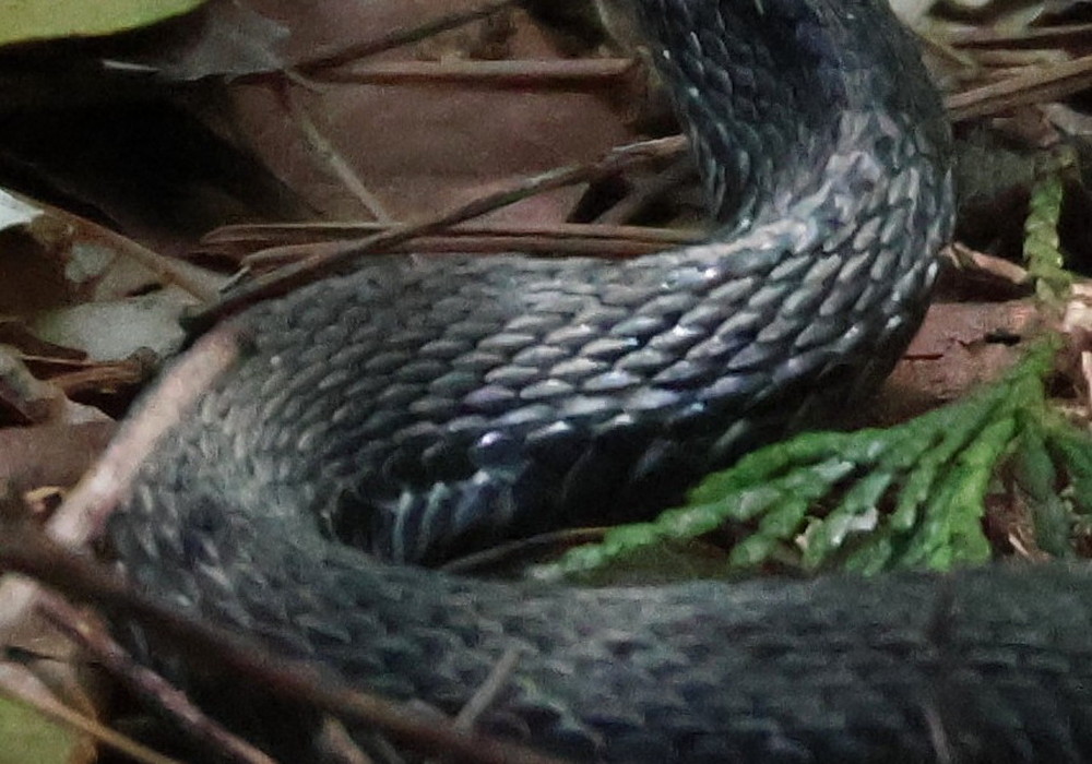 それで、下の比較ですが、宙君の黒化型ヤマカガシのアップです。鱗の表面が盛り上がった形になっているのが分かると思います。一方、kanadeさんのシマヘビ半黒化型の鱗は平坦で盛り上がっていません。両者の区別は鱗の形で判断するのが確実のようです。ちなみに、マムシの場合、体型がずんぐりして頭部が顕著に三角型になることで区別できると思います。
