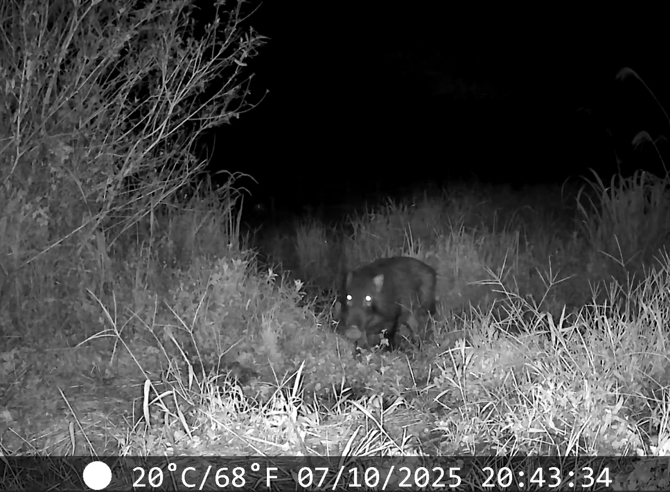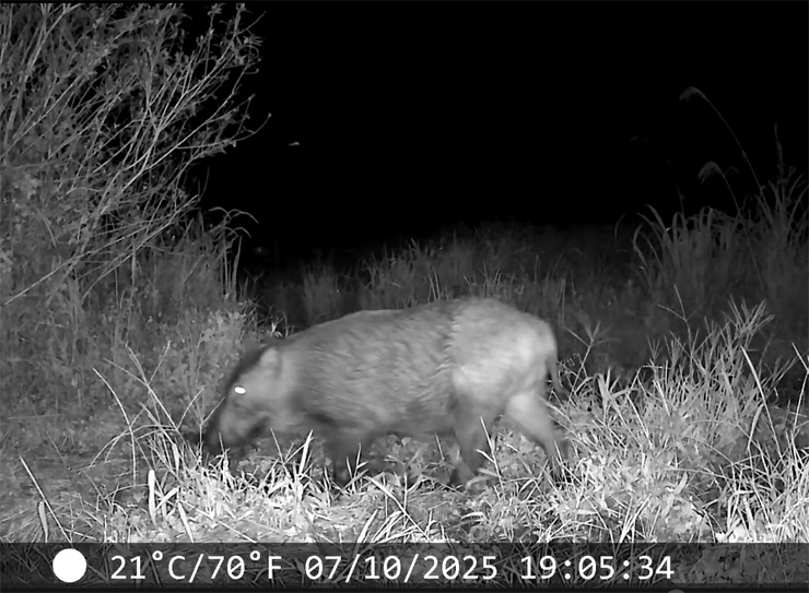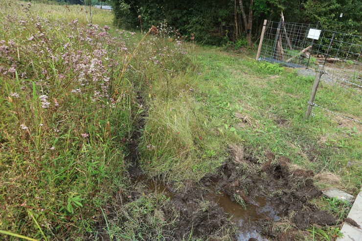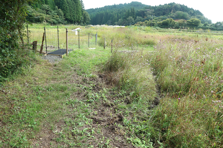 監視カメラその2は、その1の先にある水路を渡った土手横に設置してあります。先日、このカメラに、その1カメラに写らなくなったイノシシ成獣が写っていました。どうやってここに来たのか?