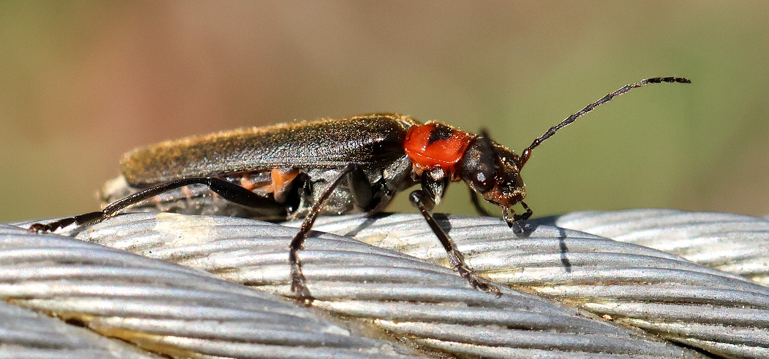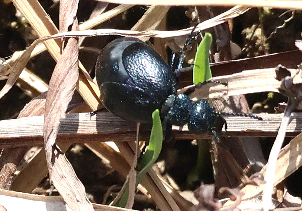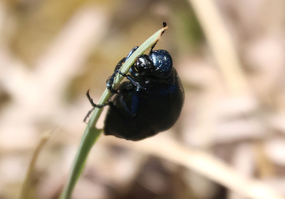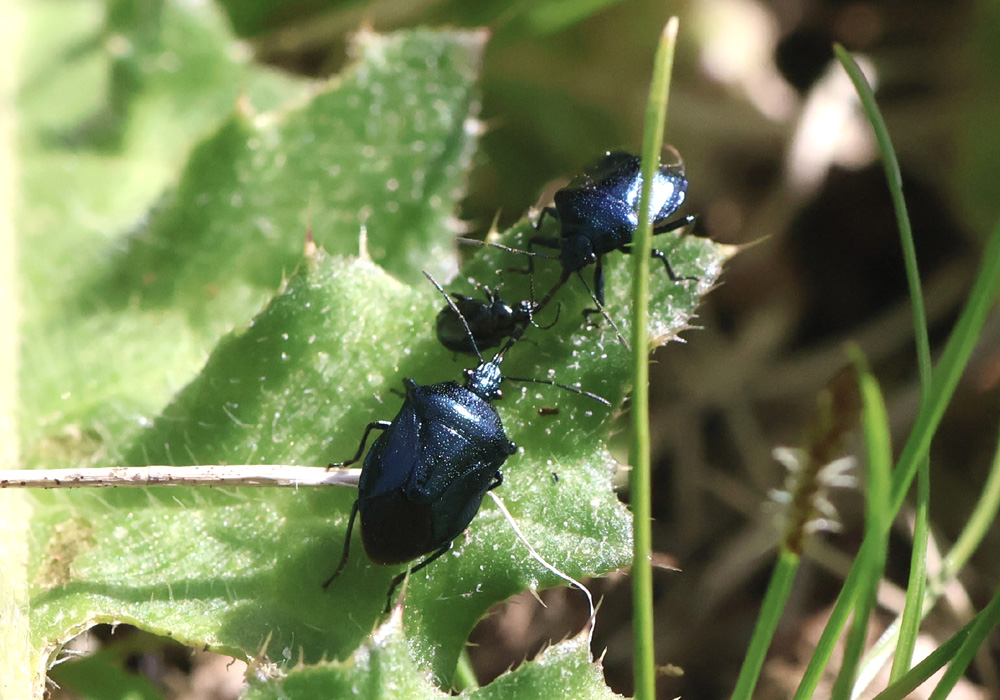 メタリックブルーの綺麗なカメムシです。2匹でハムシを捕食していました。