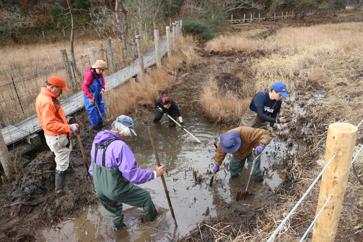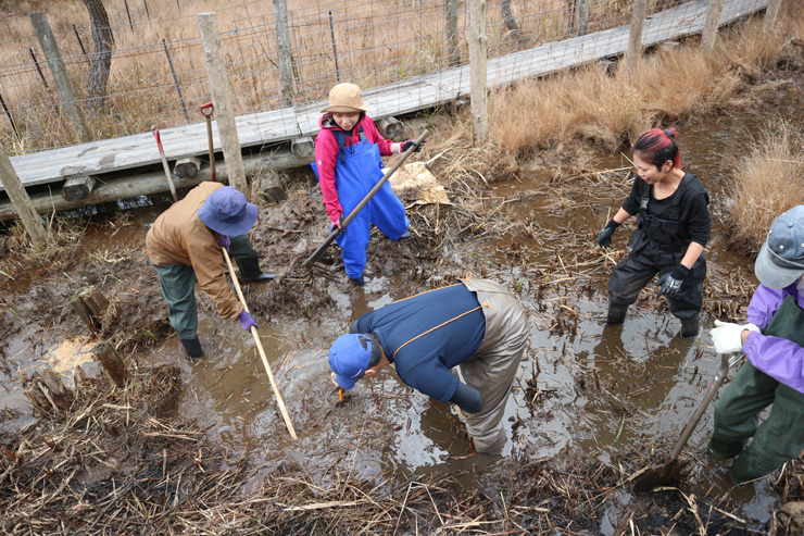 胴長装着が5人。これ以上の人数が水の中に入ると、浚渫土の陸揚げ作業が追いつかなくなります。丁度良い案配。時間が経つにつれて要領が良くなり、予想以上にはかどりました。まだまだやる気は衰えていませんでしたが、適当な時間で本日の作業は終了。予想以上に、十分、浚渫が進みました。お疲れ様でした。