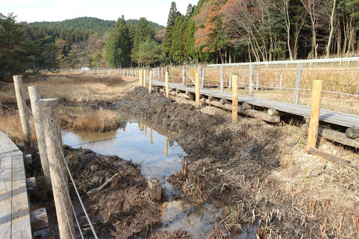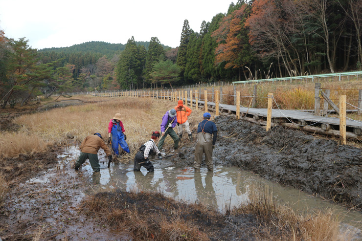 湿地Ⅱの池尻部には流入土砂が堆積してほぼ陸域化していました。今年中にはぜひ浚渫したいと思っていたのですが、12月1日、佐賀県担当課(有明海再生・環境課)の方々がやる気満々で作業に来られました。当日は守る会の活動日でしたので、守る会の方々も参加。保全作業初の県担当課と守る会の共同作業となりました。