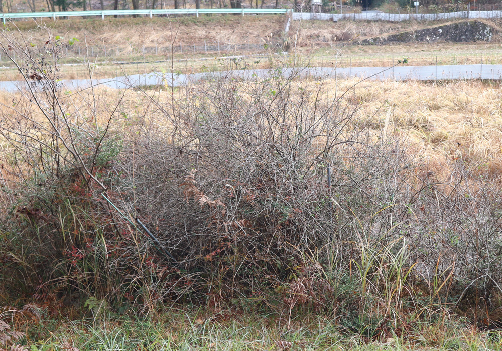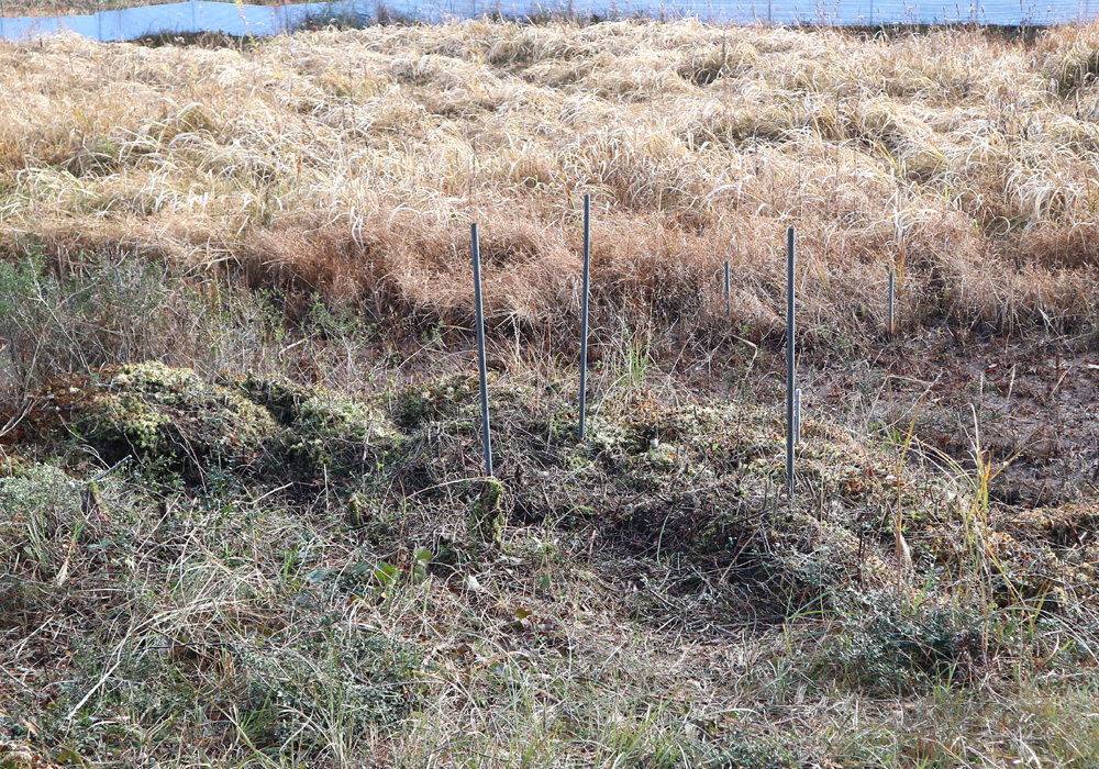 変化が進みすぎましたので、今年、上部植生を全て刈り取り、リセットしました。今後どう変化するのかをまたモニタリングする予定です。2015年当時とは異なり、既にイヌツゲ、スイカズラ、ヌルデなどの木本類の切り株が群落内にあります。多分、5年以内のかなり速いスピードで低木林に変化するのではないかと思っています。