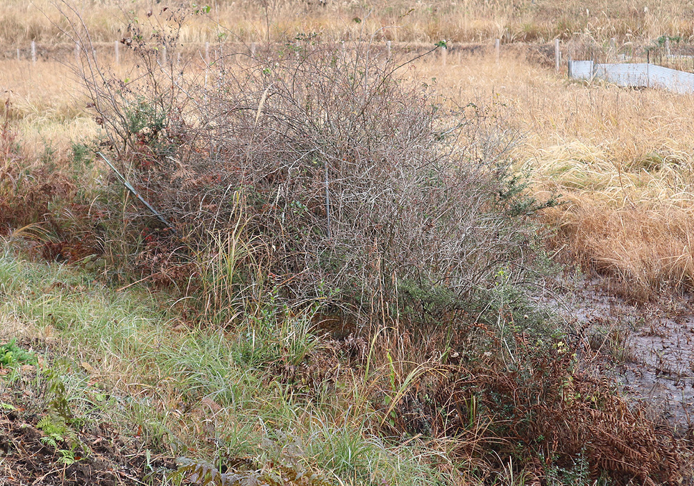 あれから10年、上層の植生は大きく変化し、群落高は2.5mで、ミヤコイバラが植被率90%に達するオオミズゴケ-ミヤコイバラ群落状態になりました。また、群落内には、ヤマツツジ、ヌルデ等が入り、湿生低木林から次の段階への変化の兆しが感じられる状況になってきました。たった10年でこんなに変化するのかと驚いてしまいます。手を付けなければ、こんな風にどんどん森になって行くんですね。