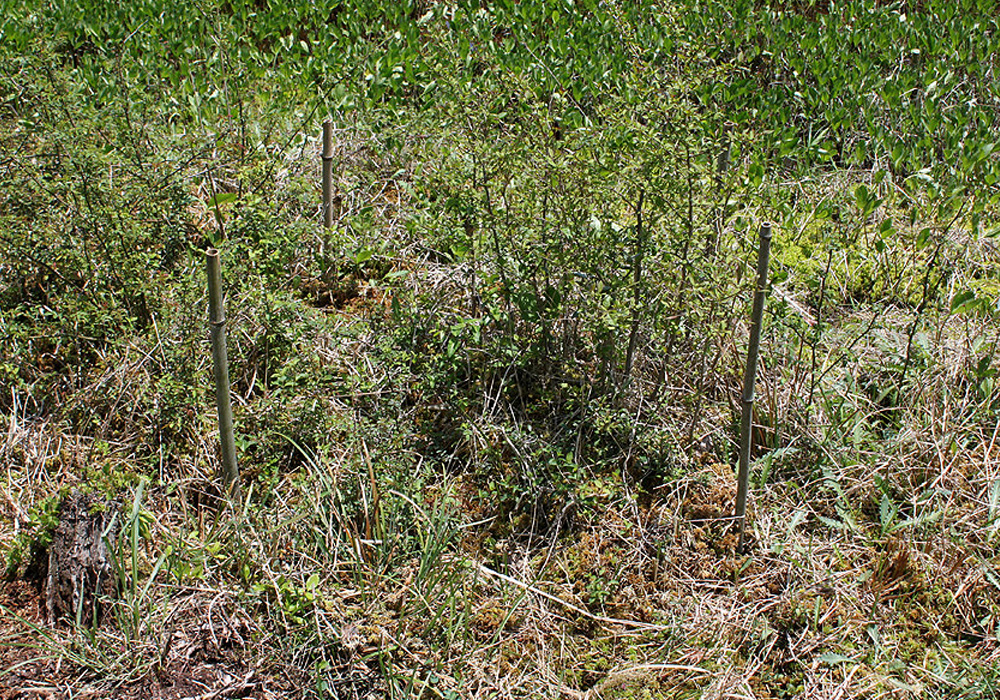 2015年に、湿地Ⅳ辺部に湿生低木林の変化をモニタリングする調査区を設置しました。当時、群落高は1m程で、下層はオオミズゴケが100%優占し、上層にはイヌウメモドキが植被率30%程度に生育する、湿生低木林の初期的状態でした。