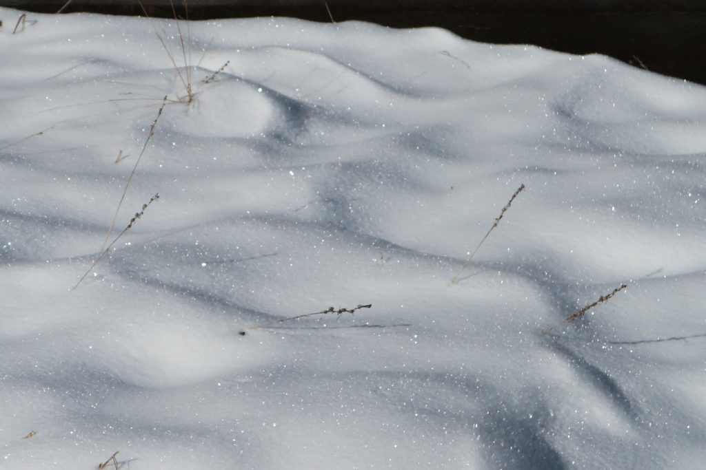 表面霜(ひょうめんそう)と言うらしい。「夜間に冷え込んだ積雪面に空気中の水蒸気が凝結したもの」とのこと。厳冬期の自然からの贈り物は、北国だけのものではないようです。(画面、拡大してみて下さい。)