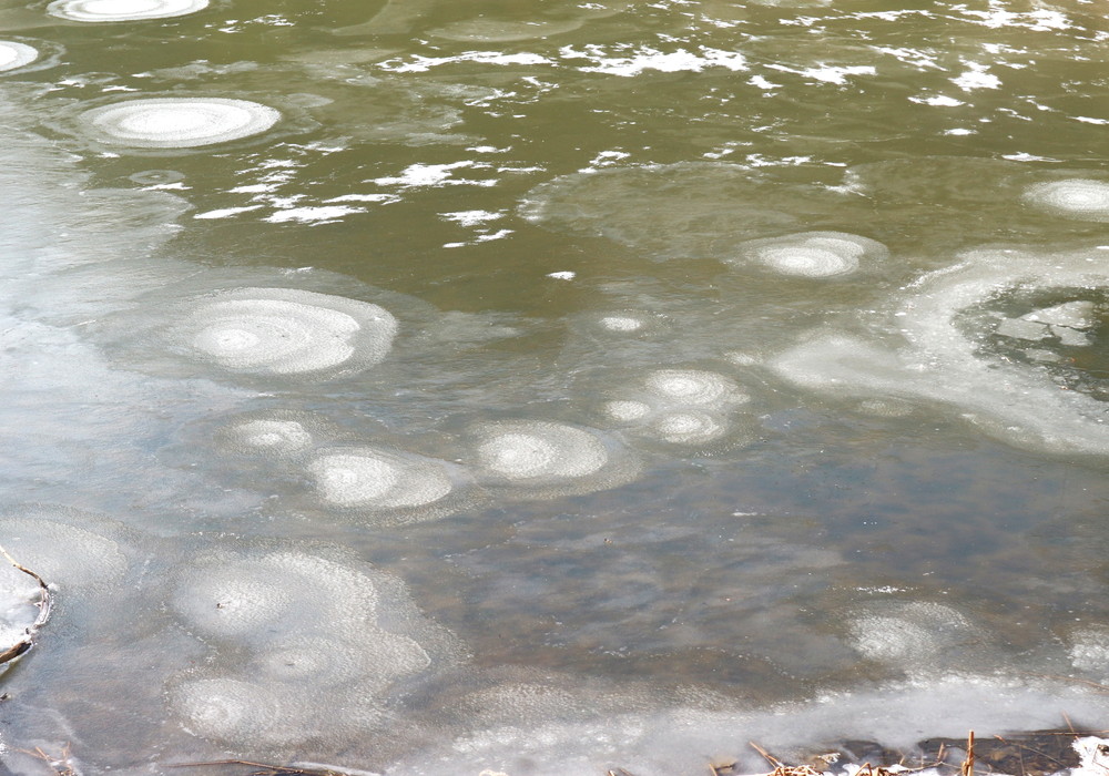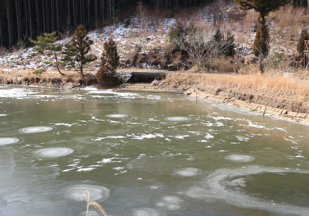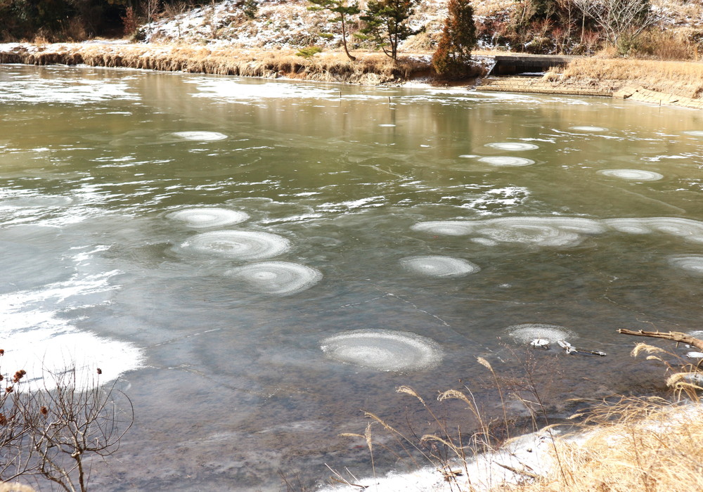 今朝はかなり冷え込んだらしい。ため池の全面に氷がはっていました。ところが、よく見ると、そこに大小の円形の模様がたくさん。なんだ、これは?・・・ 「氷紋」 と言うらしい。いろいろ調べてみるとかなり珍しい現象のようです。九州ではほとんど見ることのない自然現象かも。ラッキー! 今年は何か良いことがあるかも知れない。とりあえず宝くじでも買おうか。